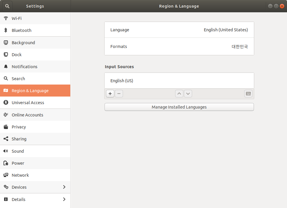 우분투 Setting에서 Region & Language 수행 - Manage installed Language 버튼 실행한다.